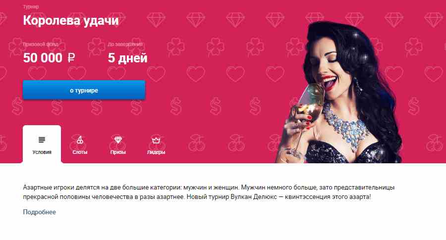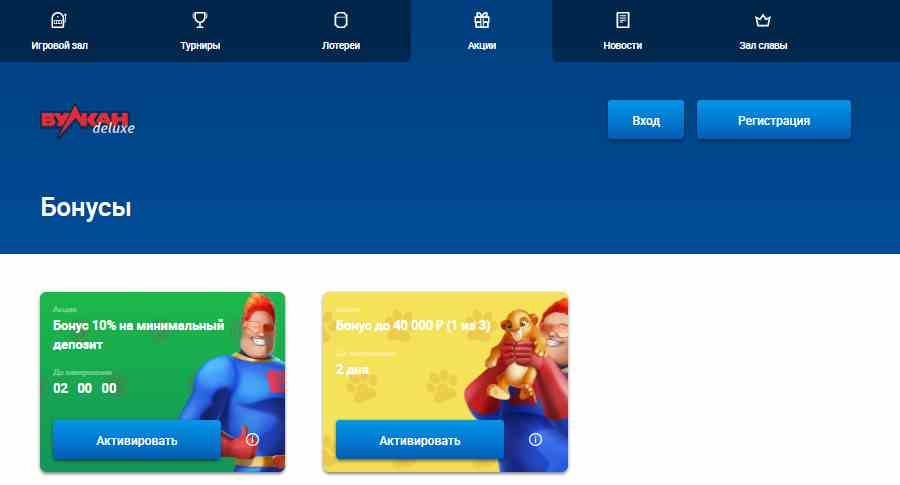 Азартное заведение строит свою политику бонусов не так, как большинство современных клубов. В отличие от конкурентов, Vulkan Deluxe не надо привлекать новых клиентов настолько активно, чтобы внедрять бонусы вроде 100% на депозит для новичков и другие схожие предложения.
