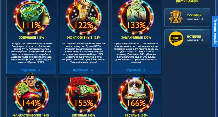 Независимо от того, что будет использовано – официальный сайт или мобильная версия казино, с первых минут пребывания в Vulcan Neon ощущается праздничное настроение от предвкушения больших выигрышей.